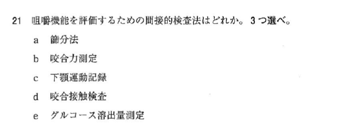 この問題では、咀嚼機能の「直接的検査」「間接的検査」を区別する必要があります。